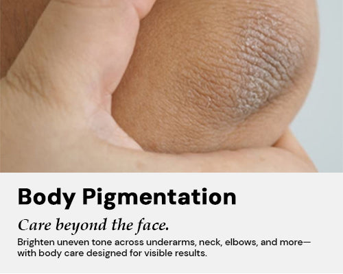 Body pigmentation is often caused by sun exposure, friction, hormonal imbalance, or dryness, and can make areas like the underarms, knees, and neck appear darker or patchy.